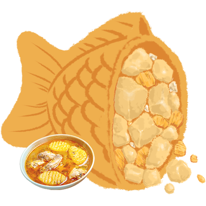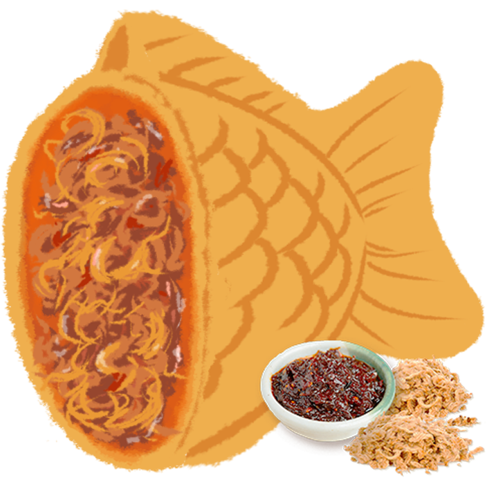ピリ辛でパンチがあり、たい焼きの生地と 合う新しい「ご飯たい焼き」。